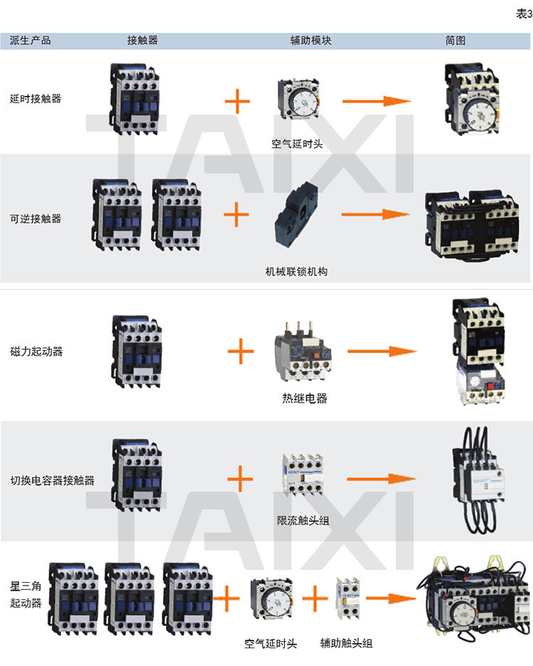 3、可以采用積木式安裝方式加裝輔助觸頭組、空氣延時頭(其延時范圍見表4)、熱繼電器等附件, 組合成多種派生產(chǎn)品(見表3)。