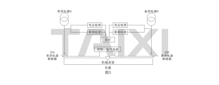 當(dāng)常用電源失壓后,自動(dòng)延時(shí)斷開(kāi)常用電源斷路器,合上備用電源斷路器,當(dāng)常用電源電壓恢復(fù)時(shí),延時(shí)斷開(kāi)備用電源斷路器,回復(fù)常用電源供電。主要用于配電線路末端一級(jí),供消防、風(fēng)機(jī)、應(yīng)急照明、供水等電路用。TXQ3規(guī)格雙電源采用微信斷路器構(gòu)成,特別適用于照明、小型電機(jī)控制設(shè)備。