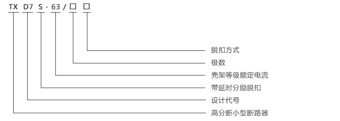 TXD7S-63 帶分勵(lì)脫扣器斷路器(預(yù)付費(fèi)電表漏電斷路器/IC卡電表用斷路器),具有智能分勵(lì)脫扣器功能,適用于交流50Hz(或60Hz),額定工作電壓為110V-400V,額定電流為63A的線(xiàn)路中,對(duì)線(xiàn)路進(jìn)行遠(yuǎn)距離控制分?jǐn)嗷蜃詣?dòng)信號(hào)控制分?jǐn)?,同時(shí)對(duì)線(xiàn)路起到過(guò)載和短路漏電保護(hù)的作用。目前,廣泛應(yīng)用與IC卡預(yù)付費(fèi)電能表配套使用來(lái)控制線(xiàn)路的通斷。斷路器符合GB16917.1、GB10963、GB14048.2標(biāo)準(zhǔn),具有國(guó)際先進(jìn)水平。二、型號(hào)及其規(guī)格