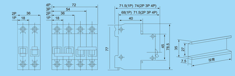 | D型 | 1、3、5、10、16、20、25、32、40、50、63 | 1、2 | 230/400 | 4500 |